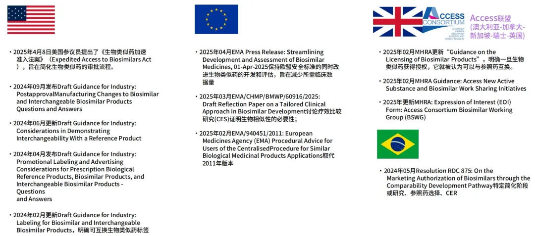 从去年开始,美国、欧洲、英国、巴西等一些主流市场都在讨论如何加速和简化整个生物类似药监管注册及降低生物类似药厂家的开发时间和成本。今年 4 月美国一位参议员提出了《生物类似药加速准入法案》来简化审批流程。同样 4 月欧洲也有一些法案提出减少所需临床数据量。