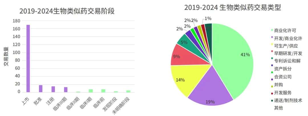 2019-2024 年绝大部分生物类似药交易发生在开发晚期,特别是药物获批后,其中 75% 的交易类型都是与商业化许可和供应相关。