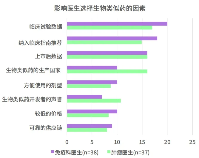 肿瘤医生和免疫科医生对数据的关注度非常高,我们可以看到,临床效果仍旧是影响医生选择生物类似药的最关键因素。除此以外,生产地、开发者的声誉及价格也是医生们会关注的问题。
