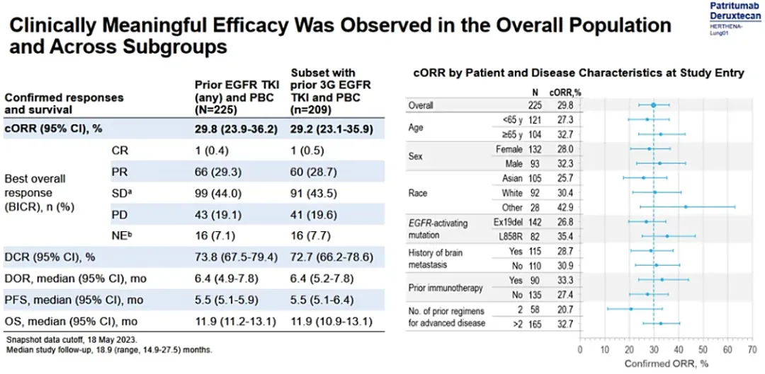 ADC也在积极拓展EGFR突变NSCLC适应症。其II期HERTHENA-Lung01研究入组了225名患者,ORR为29.8%,mDOR为6.4个月,mPFS为5.5个月,mOS为11.9个月。