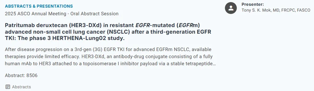 除sac-TMT之外,默沙东/第一三共HER3-DXd治疗EGFR突变NSCLC的III期临床最新数据也于ASCO官网公示。