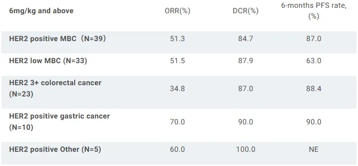 实体瘤I期研究:截至2024年10月1日,181例实体瘤(80例转移性乳腺癌,37例结直肠癌,23例胃癌,41例其它)患者入组接受治疗,其中41例参加剂量递增研究(1.5-9mg/kg),140例参加剂量扩展研究(6mg/kg或7.5mg/kg)。结果显示,中位随访8.15个月时,未出现DLT,也未达到最大耐受剂量(MTD)。在165例可评估疗效的患者中,ORR为41.2%(均为PR)。此外,7例HER2阳性乳腺癌脑转移患者实现PR,其中1例在接受4个周期治疗后实现完全缓解(CR)。