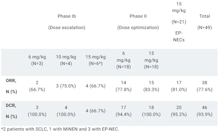 截至2024年12月26日,53例(Ib期13例,II期40例)患者入组接受治疗。结果显示,在49例可评估疗效的患者中,所有剂量组总ORR为77.6%,DCR为93.9%。在21例EP-NEC患者中,所有剂量组总ORR为81.0%,DCR为95.2%。此外,2例SCLC患者均实现ORR。结果提示LBL-024联合化疗的耐受性良好,在EP-NEC中观察到的疗效显著高于历史报道(约30%-55%)。
