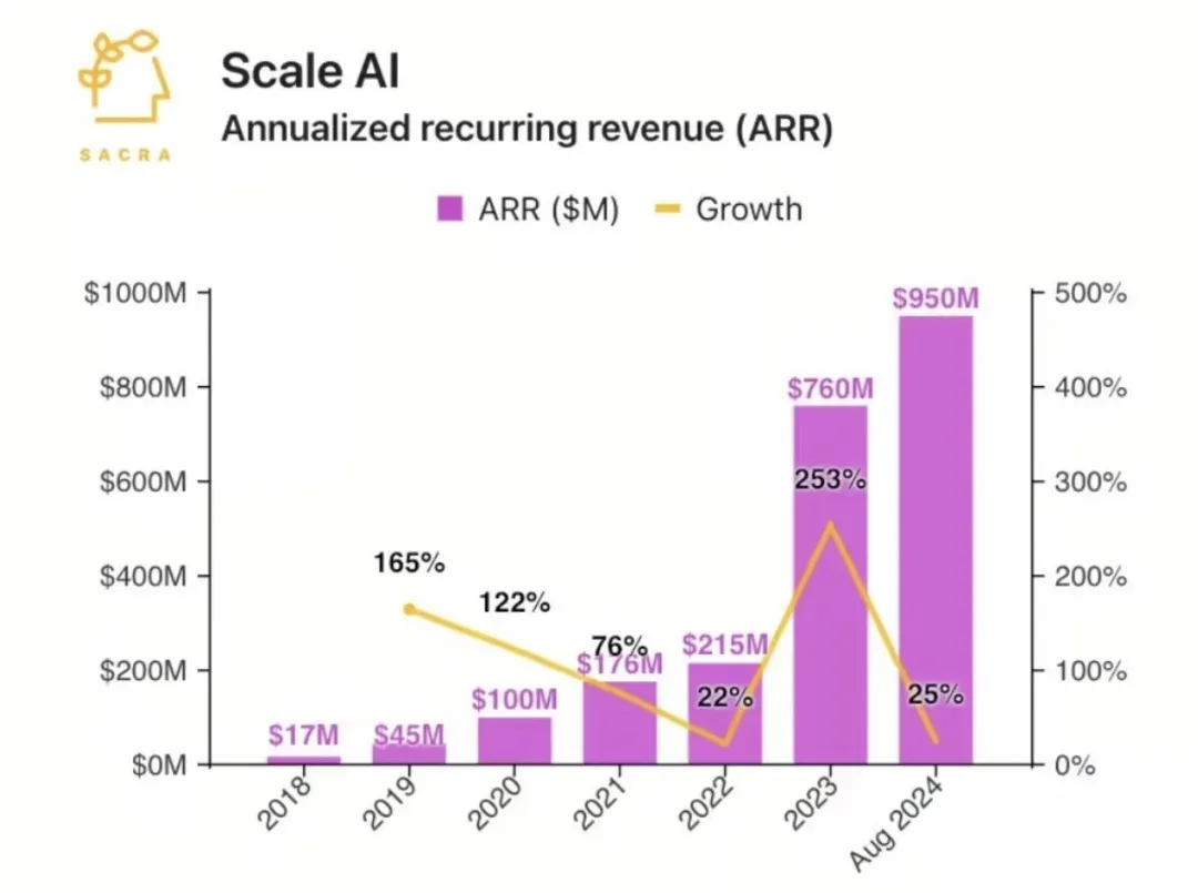 以Scale AI为例,其为AI公司提供数据标注服务,成为此次AI热潮中受益最多的企业之一,公司年度经常性收入(ARR)从2018年的1700万美元增长至2024年的10亿美元,公司最新估值达250亿美元。