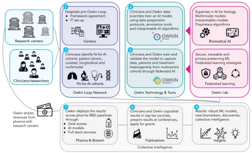 具体来看,Owkin围绕药企和医院构建了一个联邦研究生态系统,包括四个关键组件:Owkin Loop(网络,提供数据互联互通)、Owkin Connect(联邦学习框架)、Owkin Studio(AI软件工具开发平台)和 Owkin Lab(专业知识)。