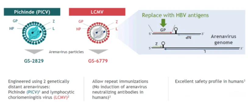 一种针对慢性HBV的沙粒病毒治疗性疫苗。GS-2829 + GS-6779是两种基于病毒载体的疫苗成分,是基于Hookipa的非复制性沙粒病毒载体(arenavirus vector)疫苗接种技术平台开发,分别使用了淋巴细胞性脉络丛脑膜炎病毒(LCMV)和水疱性口炎病毒(VSV)载体。这些载体经过改造,能够表达HBV抗原,从而激活宿主的免疫反应。