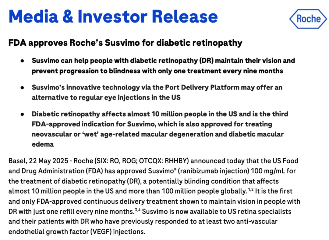 2025年5月22日,罗氏宣布,美国食品药品监督管理局(FDA)已批准Susvimo®(雷珠单抗注射液)100 mg/mL用于治疗糖尿病视网膜病变(DR)。这是一种可能导致失明的疾病,在美国影响近1000万人,全球更是有超过1亿人受此困扰。Susvimo是首个也是唯一一个经FDA批准的持续递送疗法,仅需每九个月补充一次,就能帮助DR患者维持视力。