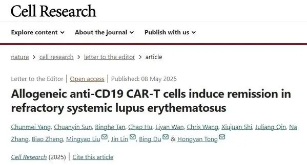 近期,邦耀生物科研团队在国际学术期刊 Cell Research 上发表突破性临床研究成果,披露了其基于 CRISPR/Cas9 基因编辑技术构建的异体抗 CD19 CAR-T 细胞(BRL-303)在难治性系统性红斑狼疮(SLE)治疗中的临床数据。结果表明,BRL-303 在 SLE 治疗中展现出快速深度的疾病缓解能力,且未发现严重不良事件,验证了该疗法的临床安全性和有效性。