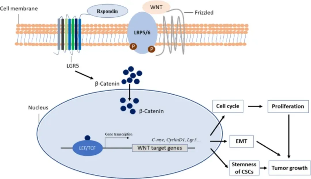 那么该靶点又跟癌症有什么关系呢?这个奥秘在于wnt通路之中。我们之前的文章中有提到,wnt通路与细胞的不正常生长和增殖是密切相关的,而LGR5靶蛋白质就是该通路之中的一员。具体来说,LGR5与癌症的关系可以概括为以下几点: