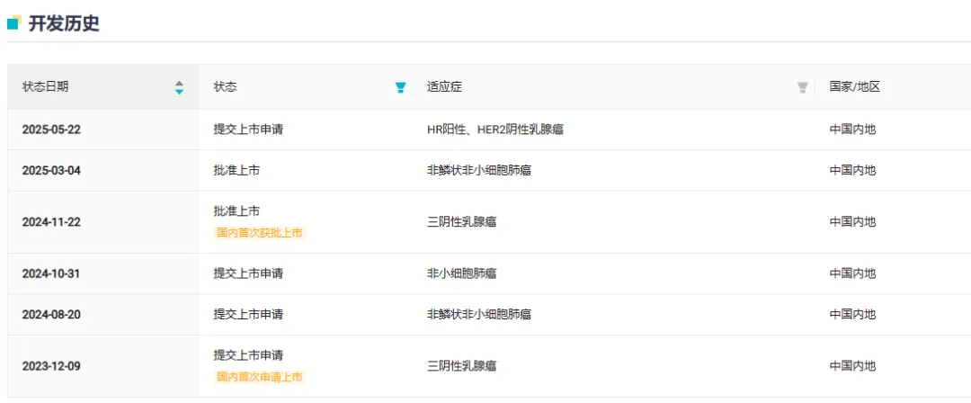 5 月 22 日,科伦博泰芦康沙妥珠单抗的第 4 项上市申请获 CDE 受理,用于治疗既往接受过内分泌治疗且在晚期或转移性阶段接受过其他系统治疗的不可切除的局部晚期或转移性 HR+/ HER2- 乳腺癌成人患者。该适应症已被 CDE 纳入优先审评。