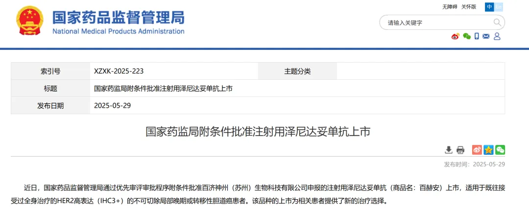 2、百济神州(苏州)生物科技有限公司申报的注射用泽尼达妥单抗,适用于既往接受过全身治疗的HER2高表达(IHC3+)的不可切除局部晚期或转移性胆道癌患者。