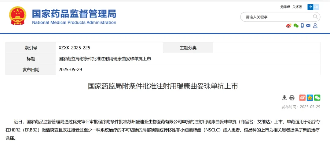 3、苏州盛迪亚生物医药申报的注射用瑞康曲妥珠单抗,单药适用于治疗存在HER2(ERBB2)激活突变且既往接受过至少一种系统治疗的不可切除的局部晚期或转移性非小细胞肺癌(NSCLC)成人患者。