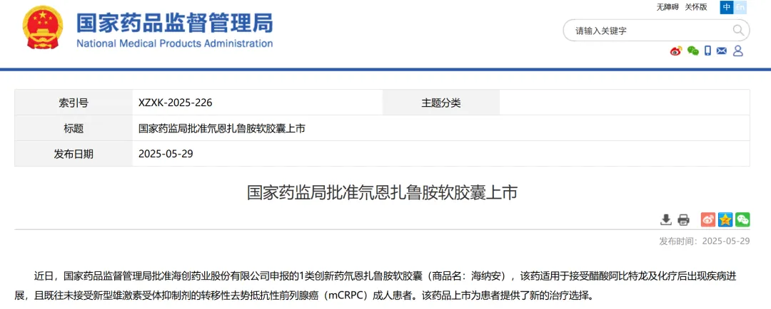 4、海创药业申报的氘恩扎鲁胺软胶囊,该药适用于接受醋酸阿比特龙及化疗后出现疾病进展,且既往未接受新型雄激素受体抑制剂的转移性去势抵抗性前列腺癌(mCRPC)成人患者。