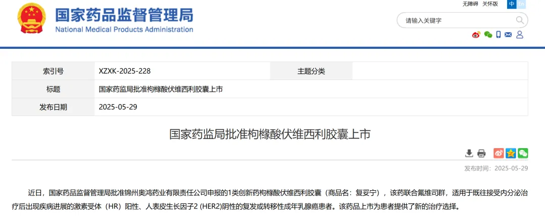 5、锦州奥鸿药业申报的枸橼酸伏维西利胶囊,该药联合氟维司群,适用于既往接受内分泌治疗后出现疾病进展的激素受体(HR)阳性、人表皮生长因子2(HER2)阴性的复发或转移性成年乳腺癌患者。