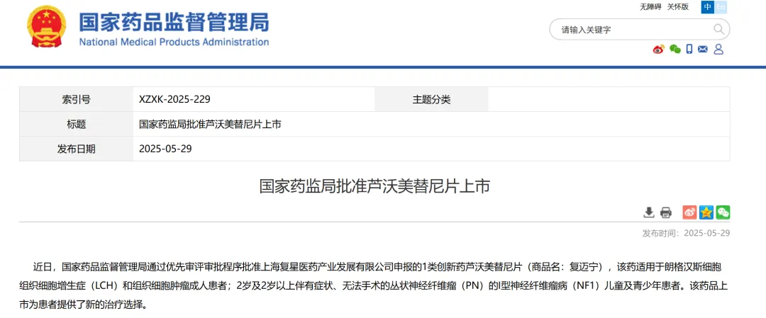 6、上海复星医药产业发展有限公司申报的芦沃美替尼片,该药适用于朗格汉斯细胞组织细胞增生症(LCH)和组织细胞肿瘤成人患者;2岁及2岁以上伴有症状、无法手术的丛状神经纤维瘤(PN)的I型神经纤维瘤病(NF1)儿童及青少年患者。