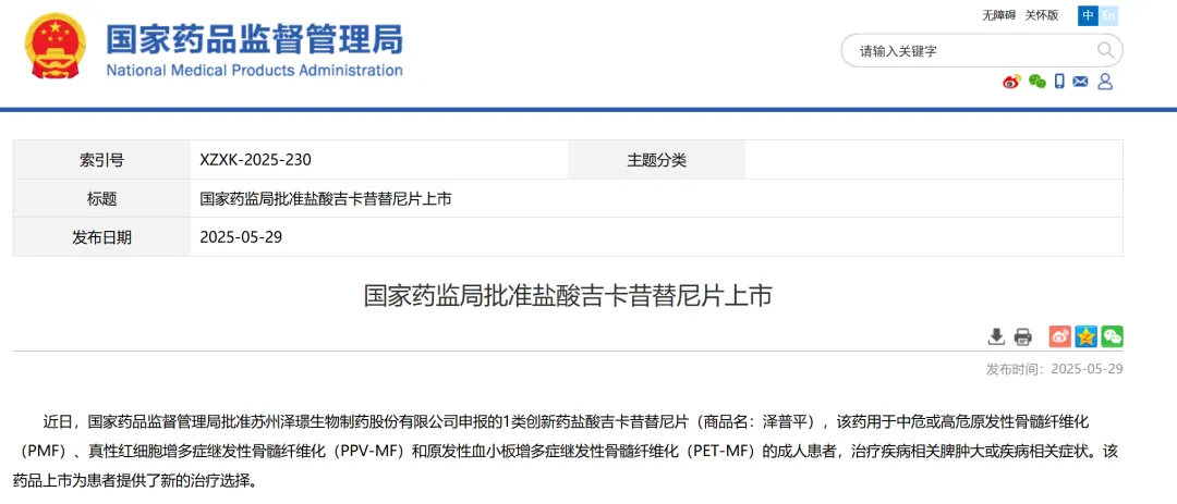 7、苏州泽璟生物制药申报的盐酸吉卡昔替尼片,该药用于中危或高危原发性骨髓纤维化(PMF)、真性红细胞增多症继发性骨髓纤维化(PPV-MF)和原发性血小板增多症继发性骨髓纤维化(PET-MF)的成人患者,治疗疾病相关脾肿大或疾病相关症状。