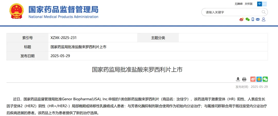 Biopharma(USA),Inc.申报的盐酸来罗西利片,该药适用于激素受体(HR)阳性、人表皮生长因子受体2(HER2)阴性(HR+/HER2-)局部晚期或转移性乳腺癌成人患者:与芳香化酶抑制剂联合使用作为初始内分泌治疗;与氟维司群联合用于既往接受内分泌治疗后疾病进展的患者。