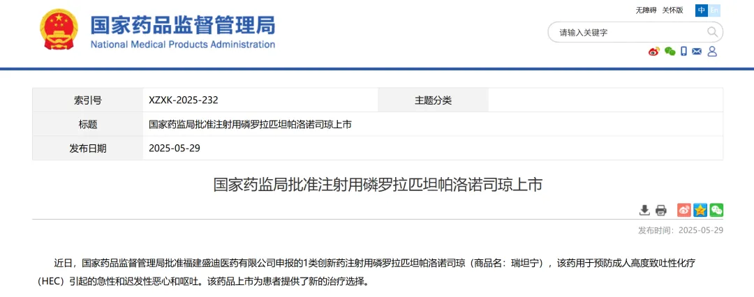 9、福建盛迪医药申报的注射用磷罗拉匹坦帕洛诺司琼,该药用于预防成人高度致吐性化疗(HEC)引起的急性和迟发性恶心和呕吐。
