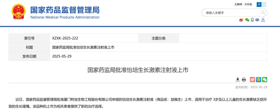 10、厦门特宝生物工程股份有限公司申报的怡培生长激素注射液,适用于治疗3岁及以上儿童的生长激素缺乏症所致的生长缓慢。