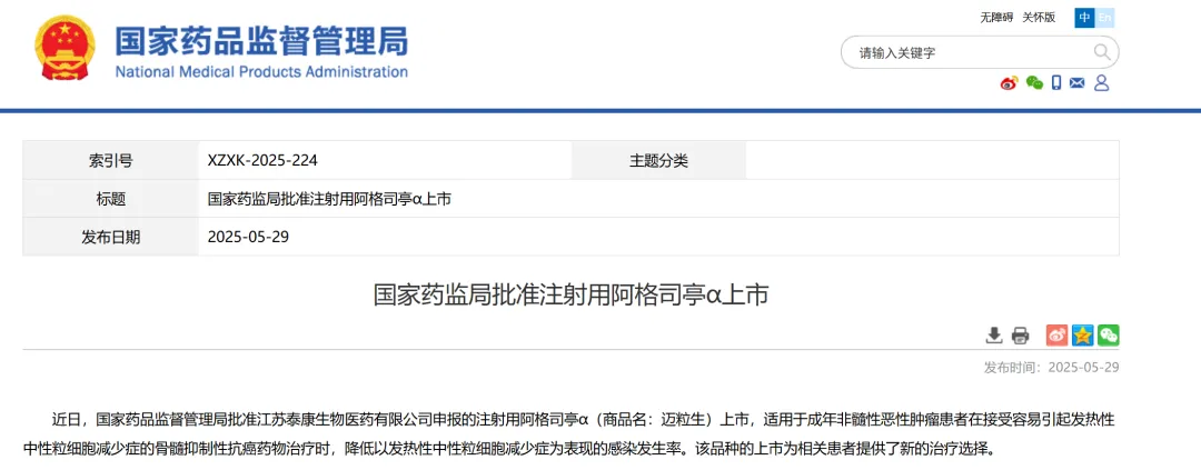 11、江苏泰康生物医药申报的注射用阿格司亭α,适用于成年非髓性恶性肿瘤患者在接受容易引起发热性中性粒细胞减少症的骨髓抑制性抗癌药物治疗时,降低以发热性中性粒细胞减少症为表现的感染发生率。