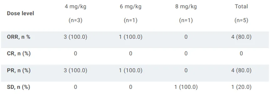 在5例疗效可评估的患者中,ORR为80.0%,DCR为100%,PFS尚未达到。安全性方面,没有患者出现间质性肺病,也没有患者因治疗期间不良事件(TEAE)停药或死亡。