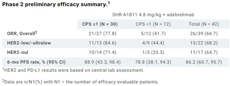 在Ib期研究(n=8)中,未观察到DLT。4.8mg/kg和5.6mg/kg剂量组的cORR分别为66.7%(2/3)和60.0%(3/5)。II期研究部分纳入了42例未经治疗的TNBC患者,评估4.8mg/kg剂量SHR-A1811。中位随访4.6个月时,39例患者可评估疗效,总体ORR为66.7%(26/39),PD-L1 CPS≥1亚组的ORR为77.8%(21/27)。SHR-A1811联合阿得贝利单抗耐受性良好,未发现新的安全问题。无论HER2或PD-L1表达状态如何,该联合治疗均显示出良好的抗肿瘤活性。