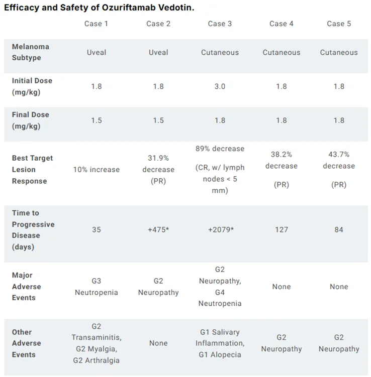 本次ASCO首次公布了ozuriftamab vedotin治疗黑色素瘤的I期研究数据。该研究纳入5例既往接受过长春花生物碱结合位点抑制剂治疗且对所有标准治疗无效的晚期皮肤或葡萄膜黑色素瘤患者。