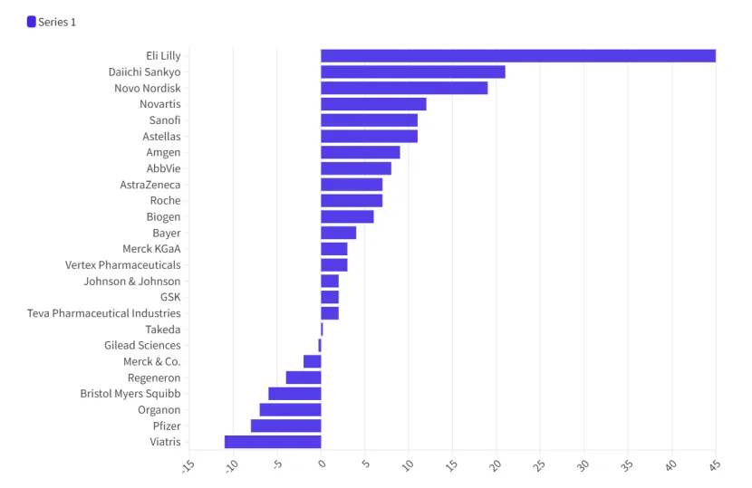 其次是辉瑞(-8%)、欧加隆、BMS(-6%)、再生元 (-4%)、默沙东 (-2%) 和吉利德 (-0.3%)。