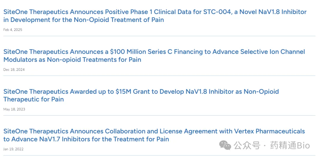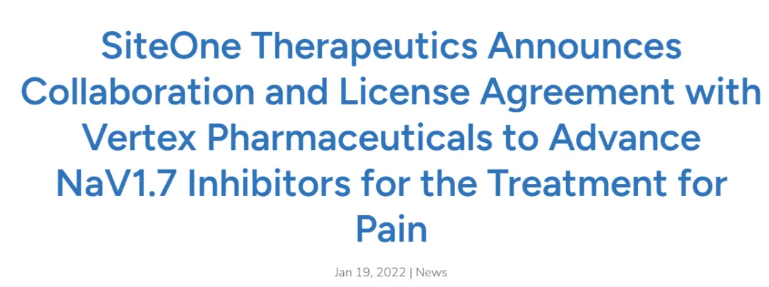2022年1月19日,SiteOne Therapeutics已与Vertex签订战略合作和许可协议。根据协议条款两家公司共同努力将钠离子通道1.7(NaV1.7)的强效选择性抑制剂作为非阿片类药物治疗疼痛。SiteOne将负责研究和早期临床前开发活动,Vertex负责后续开发和商业化。如果项目成功,SiteOne获得预付款,并有资格获得Vertex的开发、监管和商业里程碑付款以及特许权使用费。