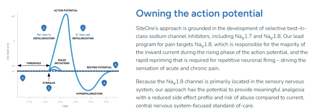 SiteOne的方法基于开发选择性最佳钠通道抑制剂,包括NaV1.7和NaV1.8。该公司的疼痛先导计划针对NaV1.8通道,该通道主要位于外周神经系统,与目前以中枢神经系统为重点的标准疗法相比,有可能提供有意义的镇痛,减少副作用和滥用风险。除了疼痛,SiteOne还在探索钠通道和其他经过基因和临床验证的靶点治疗疼痛和感觉过度兴奋障碍的潜力。