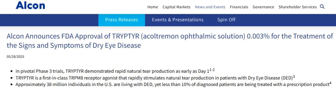 5月28日,爱尔康宣布美国FDA已批准Tryptyr(acoltremon滴眼液)0.003%用于治疗干眼症(DED)的体征和症状。Tryptyr是首个TRPM8受体激动剂(神经调节剂),通过刺激角膜感觉神经,快速增加自然泪液产生。