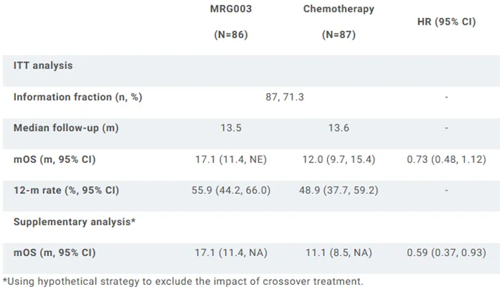 截至2024年12月31日,两组的mOS分别为17.1个月和12.0个月(HR=0.73)。通过补充分析排除交叉治疗的影响,OS的HR为0.59,表明MRG003具有生存获益的趋势。