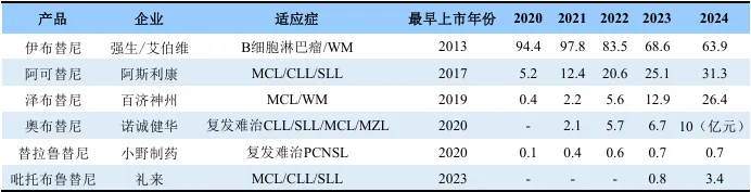 说明:WM-华氏巨球蛋白血症;MCL-套细胞淋巴瘤;CLL-慢性淋巴细胞白血病;SLL-小淋巴细胞淋巴瘤;MZL-边缘区淋巴瘤;PCNSL-原发性中枢神经系统淋巴瘤