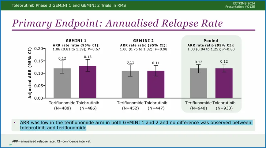 在赛诺菲的业务布局中,炎症免疫是最重要的板块之一。Tolebrutinib是赛诺菲在自免领域布局的潜在重磅炸弹。去年,赛诺菲在多发性硬化治疗与研究委员会大会上公布了Tolebrutinib的3项III期临床试验相关数据。虽然,针对复发型多发性硬化症的GEMINI 1和GEMINI 2试验没有达到年化复发率(ARR)这一主要终点,但针对非复发性继发进展型多发性硬化症HERCULES试验达到了主要终点。