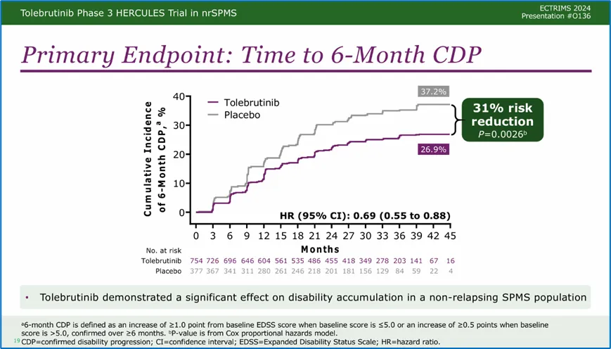 HERCULES临床试验结果显示,在非复发性继发进展型MS患者中,相比安慰剂,Tolebrutinib能够将持续至少6个月内的确认残疾进展(CDP)风险降低31%,而这也是目前首个也是唯一一个在延缓非复发性继发进展型MS患者残疾进展方面显示出积极作用的治疗药物。