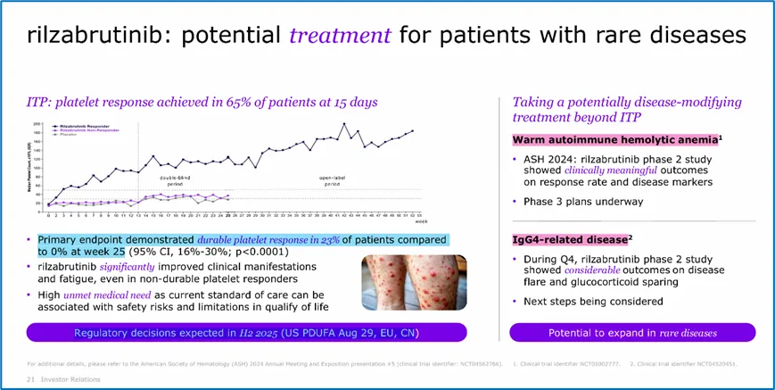 除了免疫性血小板减少症外,Rilzabrutinib还在探索温抗体型自身免疫性溶血性贫血、免疫球蛋白G4相关疾病等罕见病中的治疗潜力,目前均已在II期临床试验中取得积极的疗效结果,相关III期临床试验正在进行中。