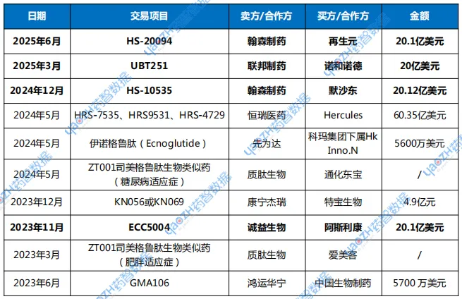 表1 近几年国产GLP-1药物交易汇总