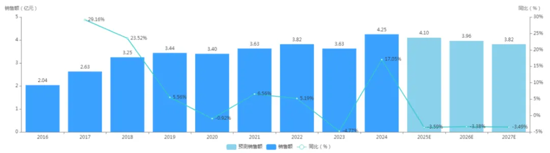 药智数据显示,2016年至2024年国内苯溴马隆的销售额持续上升,2024年该药物国内公立医疗机构销售额达到4.25亿元。
