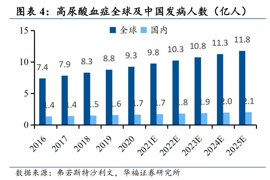 弗若斯特沙利文研究显示,2020年全球高尿酸血症患病人数约9.3亿,痛风患者达2.2亿。《2021中国高尿酸及痛风趋势白皮书》指出,我国高尿酸血症患病率总体水平为13.3%,患病人群规模约1.77亿。这一系列数据凸显出高尿酸血症及痛风在我国乃至全球范围内日益严峻的疾病负担。