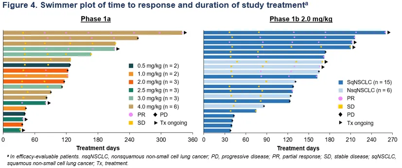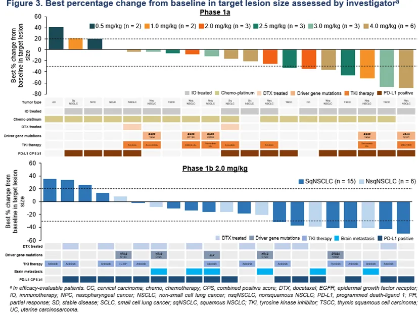 研究者评估的Ia期的客观缓解率(ORR)为36.8%;75%的胸腺鳞状细胞癌患者达到部分缓解(3/4名,ORR = 75%)。Ib期2.0 mg/kg组NSCLC患者经研究者评估的ORR为38.1%,其中鳞状NSCLC患者的ORR为40%。值得关注的是,脑转移NSCLC患者的疾病控制率(DCR)达到100%。