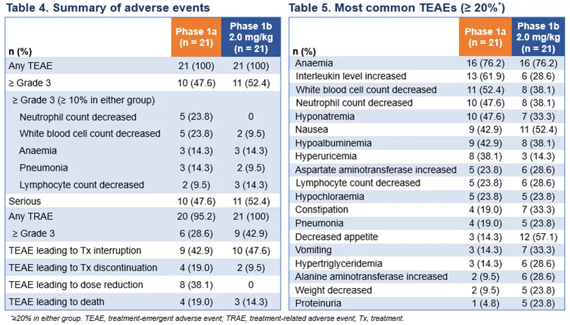 所有的患者均报告有治疗期间出现的不良事件(TEAEs),大多为1-2级。Ia和Ib期研究中,3级或以上的治疗相关不良事件(TRAE)发生率分别为28.6%(Ia)和42.9%(Ib,2.0mg/kg)。2.0