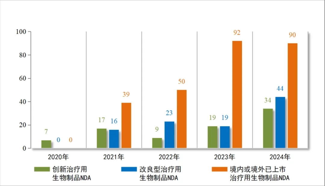 在2类改良型生物制品注册分类刚推出时,2.4类改良型新药吸引了不少企业布局。同3.4类相似,有些2.4类产品同样是法规更迭期转换了开发策略的生物类似药。后来,审评要求逐渐收紧,如要求2.4类与原研药开展头对头研究并证明优势,使得这一路径的热度逐渐冷却。据《2024年度药品审评报告》,去年2.4类临床试验申请获批的只有4个品种,获批上市的仅有1款产品。
