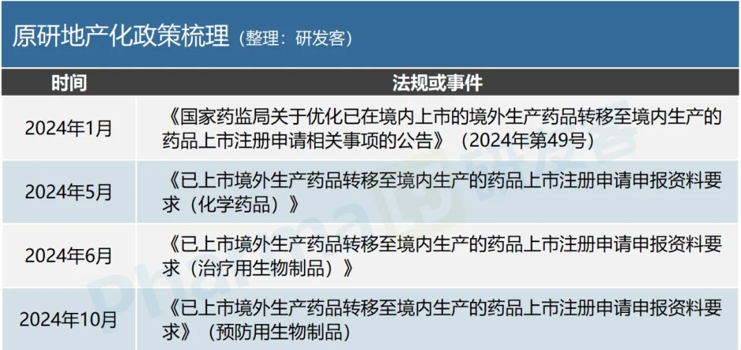 去年,围绕鼓励原研药在中国地产化的目标,国家药监局发布了一系列政策。依据申报要求,已在境内上市的境外生产药品转移至境内生产的,化学药按仿制药申报,治疗用生物制品以3.4类申报,预防用生物制品以3.3类(境内已上市疫苗)申报。