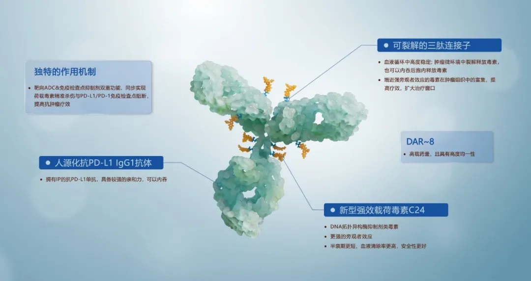 相比SGN-PDL1V采用传统的MMAE毒素、Valine-Citrulline连接子,HLX43在payload和linker的选择上实现迭代升级,创新性地采用新型强效载荷毒素C24(加强版DNA拓扑异构酶抑制剂类毒素)和可裂解的三肽连接子。