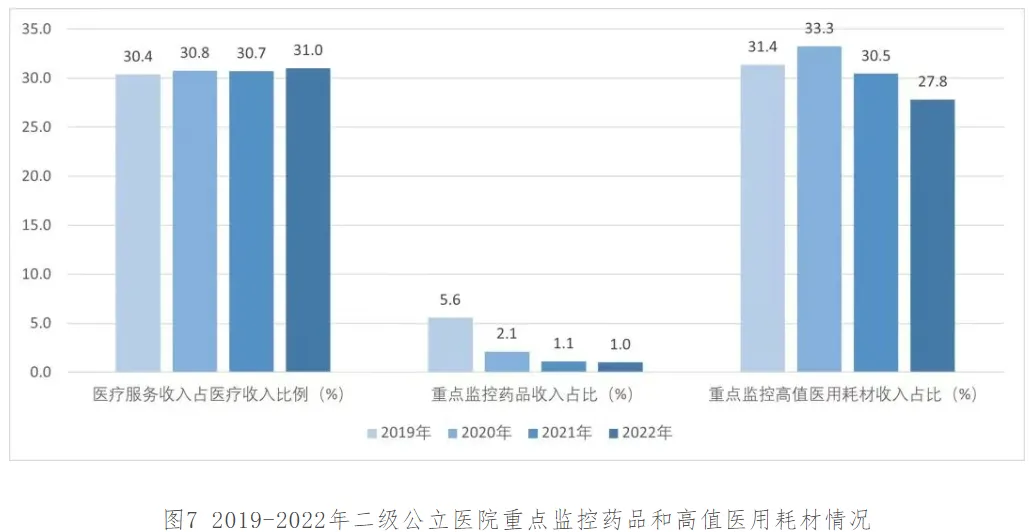 在医疗收入结构方面,医疗服务收入占比为31.0%,较2021年提升0.3个百分点;卫生材料收入和药品收入占医疗收入比例为9.2%和28.9%,较2021年分别降低0.7个、0.1个百分点;检查化验收入占医疗收入比例略有上升。其中,重点监控高值医用耗材收入占比、重点监控药品收入占比为27.8%、1.0%,较2021年分别下降2.7个和0.1个百分点(见图7)。