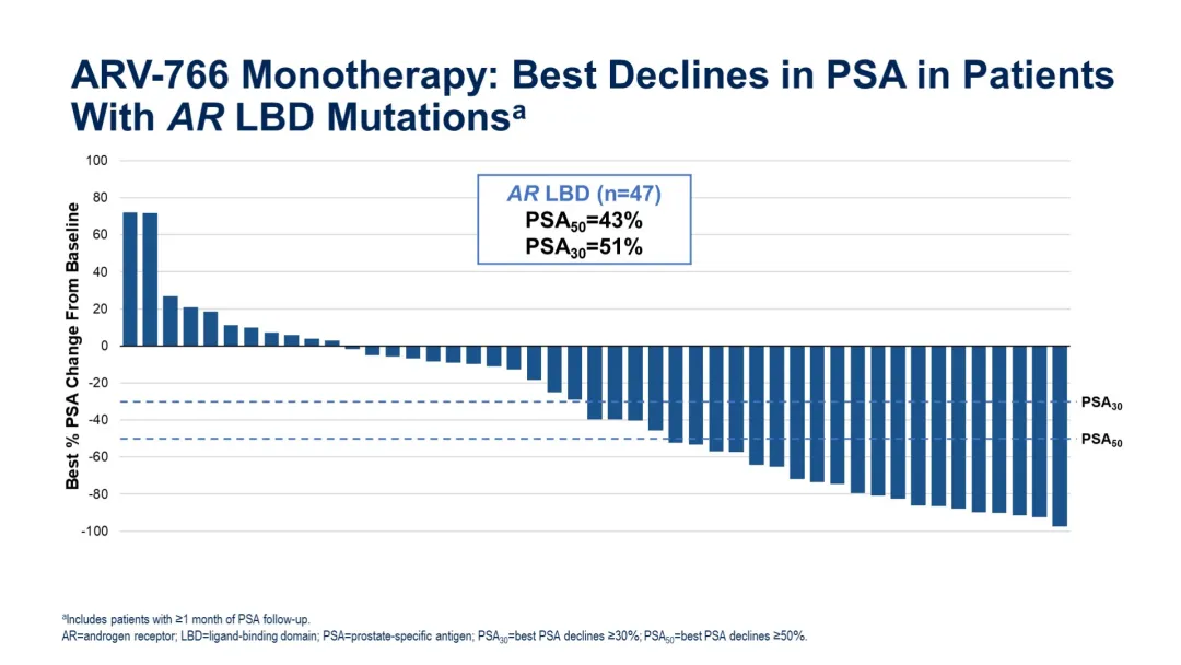 结果显示,在 47 名前列腺特异性抗原(PSA)水平可评估的 AR LBD 突变受试者中,PSA50 反应率为 43%。安全性方面,耐受性良好,没有 DLTs 发生。