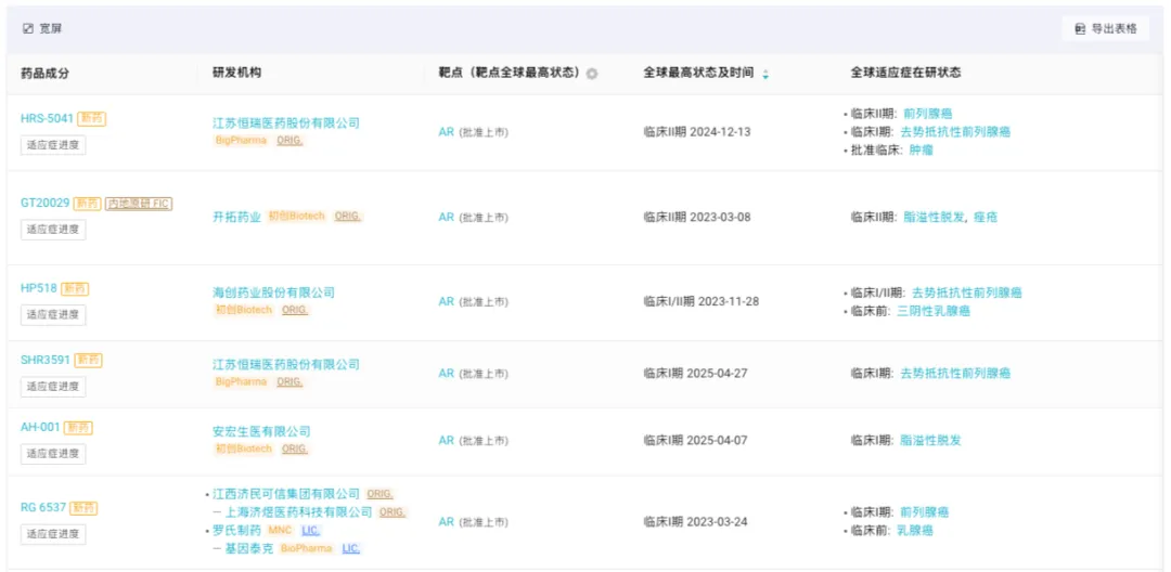 国内在研的 AR PROTAC 有 17 款,其中进入临床阶段的有 6 款,包括 HRS-5041(恒瑞)、GT20029(开拓药业)、HP518(海创药业)、SHR3591(恒瑞)、AH-001(安宏生)和 RG6537(济民可信)。