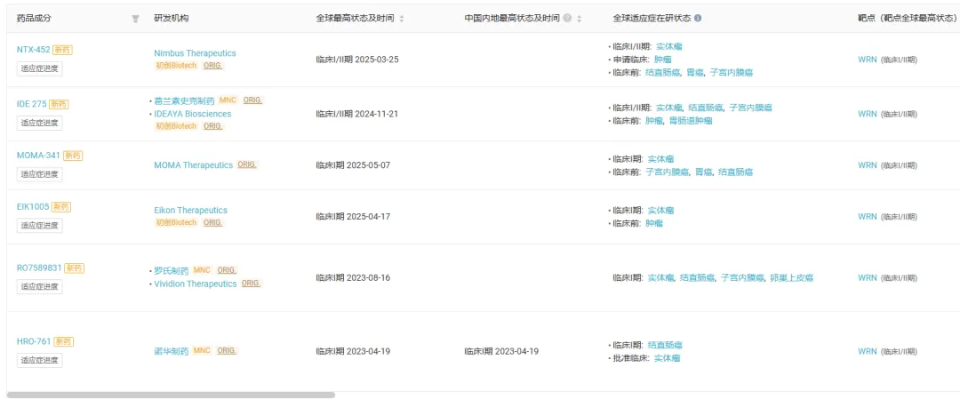 Insight 数据库显示,目前全球范围内共有 6 款 WRN 抑制剂进入临床阶段(仅统计积极状态),其中诺华和 GSK 均有入局,不过都尚处早期临床阶段。