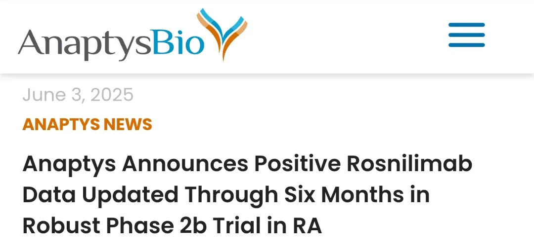 2025年6月3日,临床阶段生物技术公司AnaptysBio宣布,其研发的PD-1激动剂药物rosnilimab在治疗中重度类风湿关节炎(RA)的全球2b期临床试验中,展现出与JAK抑制剂相当的疗效。