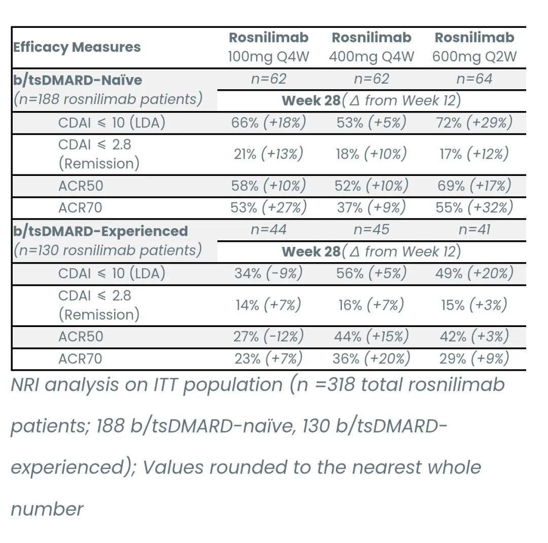 - 对于b/tsDMARD(生物制剂/靶向合成疾病修饰抗风湿药物)初治患者,600mg每两周一次(Q2W)剂量组在第28周时有72%达到CDAI LDA;